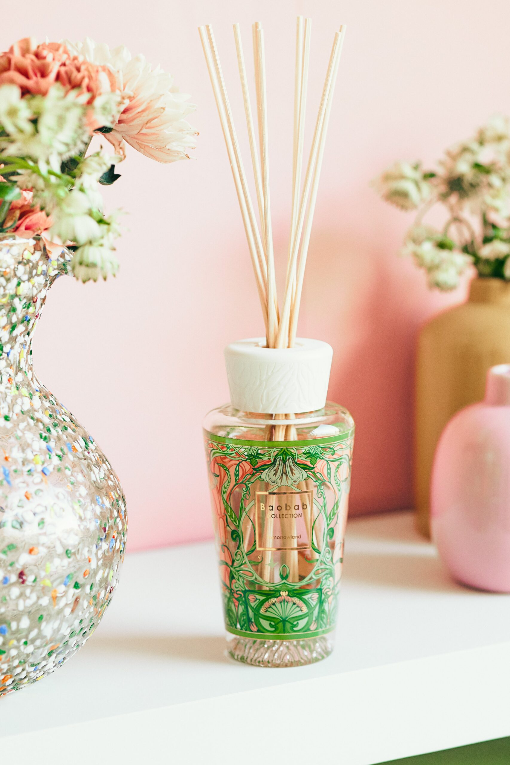 The My First Baobab Tomorrowland perfume diffuser is silk-screened in a powder pink and green design featuring the logo of the famous Belgian music festival. Its design is inspired by the Art Nouveau movement, with organic, graceful shapes reminiscent of nature. Each diffuser comes with a playlist (which you can download using a QR code on the inside of the box’s lid).